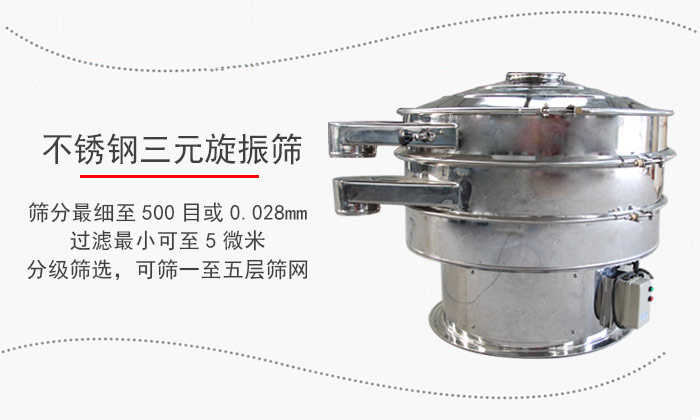 不銹鋼振動篩三元旋振篩篩選顆粒、粉末、粘液一定范圍內(nèi)均可篩選。篩分細(xì)至500目或0.028mm, 過濾小可至5微米。分級篩選,可篩一至五層篩網(wǎng),能同時(shí)進(jìn)行二至六個(gè)等級的分選或過濾。