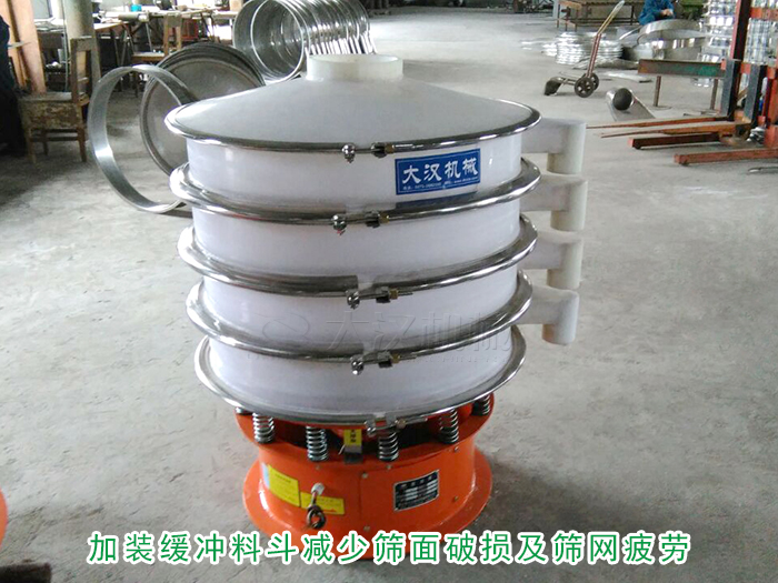 塑料旋振篩在篩分比重較大具有較強(qiáng)沖擊力的物料時(shí)必須加裝緩沖料斗,防止物料直接撞擊篩面,否則會(huì)造成篩面破損及篩網(wǎng)疲勞,還會(huì)消耗振動(dòng)電機(jī)所產(chǎn)生的激振力,影響篩分產(chǎn)量與篩分質(zhì)量。