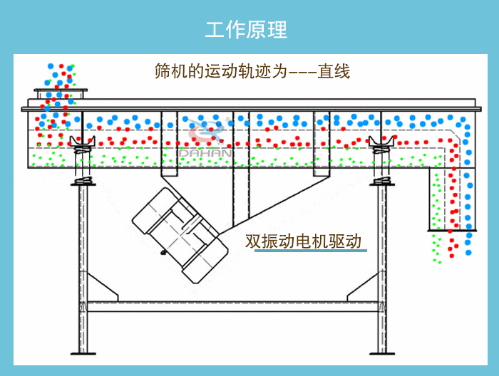DZSF系列直線振動(dòng)篩為雙振動(dòng)電機(jī)驅(qū)動(dòng)。當(dāng)兩臺(tái)振動(dòng)電機(jī)做同步、反向旋轉(zhuǎn)時(shí),其偏心塊所產(chǎn)生的激振力在平行于電機(jī)軸線的方向相互抵消,在垂直于電機(jī)軸的方向疊為一合力,因此篩機(jī)的運(yùn)動(dòng)軌跡為一直線。兩電機(jī)軸相對(duì)篩面在垂直方向有一傾角,在激振力和物料自重力的合力作用下,物料在篩面上被拋起跳躍或向前作直線運(yùn)動(dòng),從而達(dá)到對(duì)物料進(jìn)行篩選和分級(jí)的目的。適用于粒度在0.074—5mm,含水量小于7%,無(wú)粘性的各種干式粉狀或顆粒狀物料的篩分。給料粒度不大于10mm。