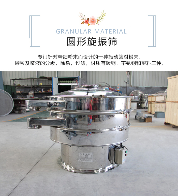 圓形旋振篩就是指篩機外觀為圓形的振動篩,也叫旋振篩,是專門針對精細粉末而設(shè)計的一種振動篩,適合對粉末,顆粒及漿液的分級,除雜,過濾,材質(zhì)有碳鋼,不銹鋼和塑料三種。不同的材質(zhì)針對不同的物料篩分。