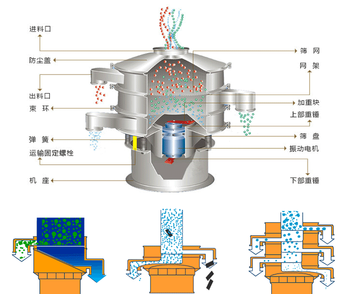 圓形旋振篩是由直立電機作為激振源,電機上,下兩端安裝偏心重錘,將電機的旋轉(zhuǎn)運動轉(zhuǎn)變?yōu)樗剑怪?,傾斜的三次元運動,再把這個運動傳遞給篩面進行篩分。