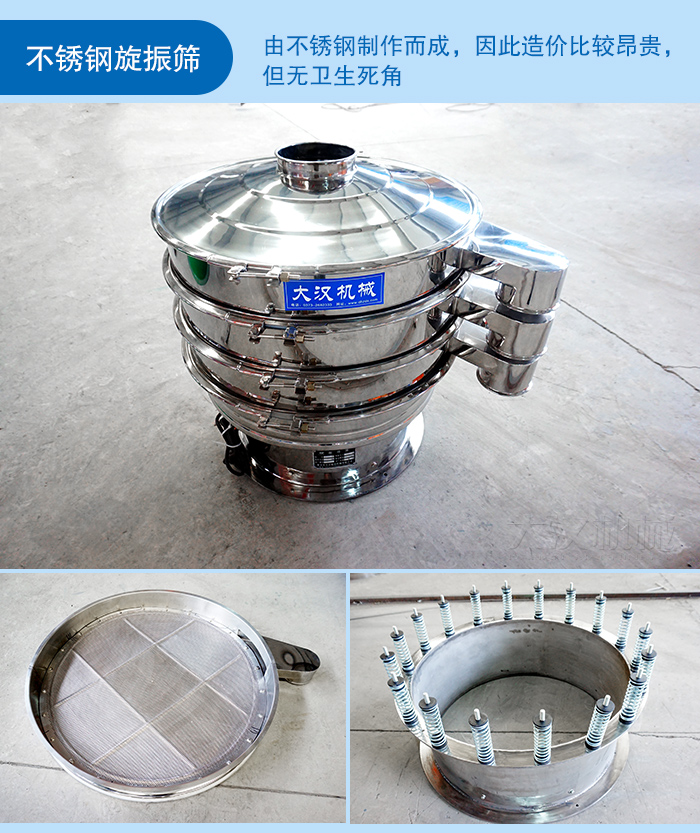 這種旋振篩無論是進出料口還是彈簧機座,全部都是由不銹鋼制作而成,因此造價比較昂貴,但無衛(wèi)生死角,非常適合一些對衛(wèi)生要求比較嚴(yán)格的物料篩分。并且不銹鋼材質(zhì)分好多種:有201、202、304、316、316L等類型。201、202的不銹鋼材質(zhì)只是比普通鋼材好了一點點,是在不銹鋼材質(zhì)中質(zhì)量差的一種,如果是用在旋振篩上用不了多久就會生銹的。304材質(zhì)的不銹鋼為普通的不銹鋼,這種不銹鋼板旋振篩常用的類型。這種材質(zhì)的鋼板跟201、202材質(zhì)相比性能優(yōu)良不少。316、316L類型的不銹鋼為比304更好一點的材質(zhì),通常是用在強酸強堿行業(yè)。這些行業(yè)對旋振篩的材質(zhì)要求十分嚴(yán)格,316L型的不銹鋼則比316型的更好。