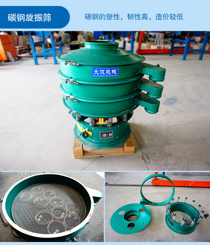 對于那些對衛(wèi)生沒有要求的普通物料,碳鋼旋振篩是物美價廉的選擇。一般碳鋼中含碳量越高則硬度越大,碳鋼的塑性,韌性高,焊接性能好、可鍛可沖壓性好、成本低、性能范圍大,這些優(yōu)良的特性足夠支撐日常旋振篩的操作。為重要的是,碳鋼造價較低,如果所篩物料對旋振篩材質(zhì)無特殊要求,那么碳鋼是您的不二之選。