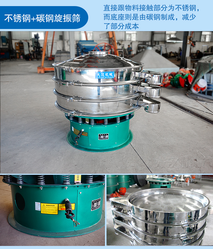 這種旋振篩的機身是不銹鋼材質(zhì),用于直接跟物料接觸,而底座則是由碳鋼制成,減少了部分成本。這種材質(zhì)的旋振篩價格比不銹鋼便宜,比碳鋼稍貴。適用于一些對衛(wèi)生要求不是很嚴(yán)格的物料。